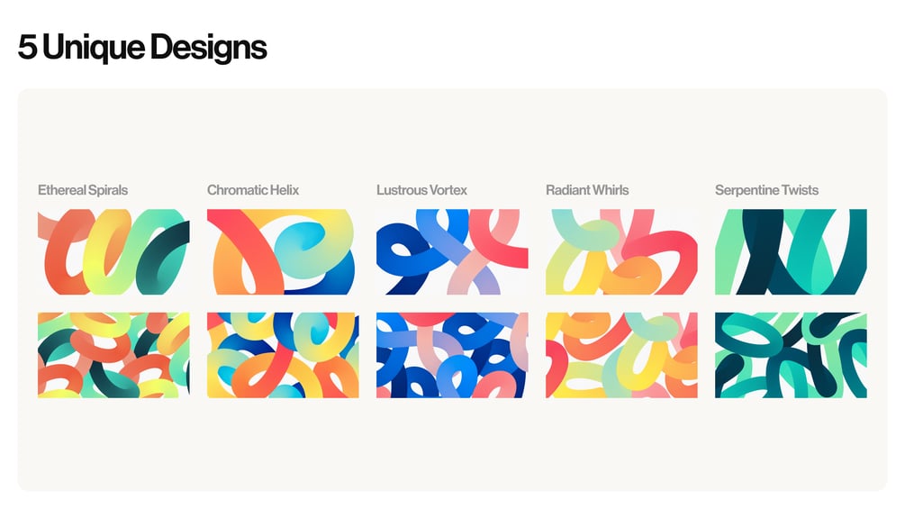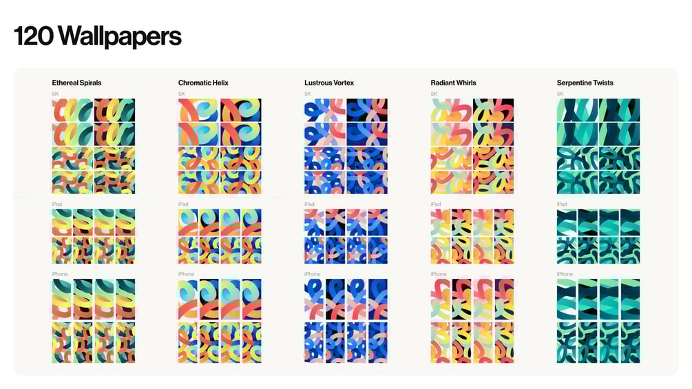5 wallpaper packs - Ethereal Spirals, Chromatic Helix, Lustrous Vortex, Radiant Whirls & Serpentine Twists.